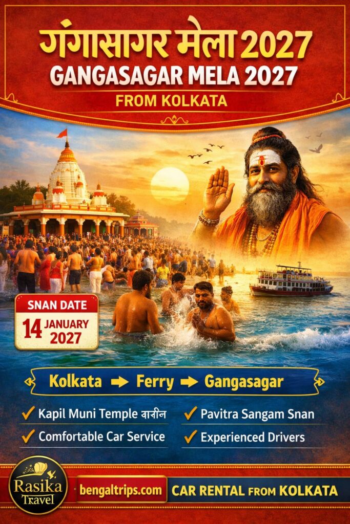 The Gangasagar Mela is one of the most sacred and largest religious gatherings in India, attracting लाखों श्रद्धालु every year. Held during Makar Sankranti in West Bengal, this spiritual event takes place at the holy confluence of the River Ganga and the Bay of Bengal. If you are planning a Gangasagar tour from Kolkata, this complete guide by Rasika Travel – Bengal Trips will help you with everything — route, cost, travel tips, and booking options.